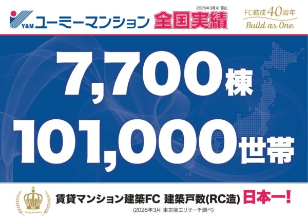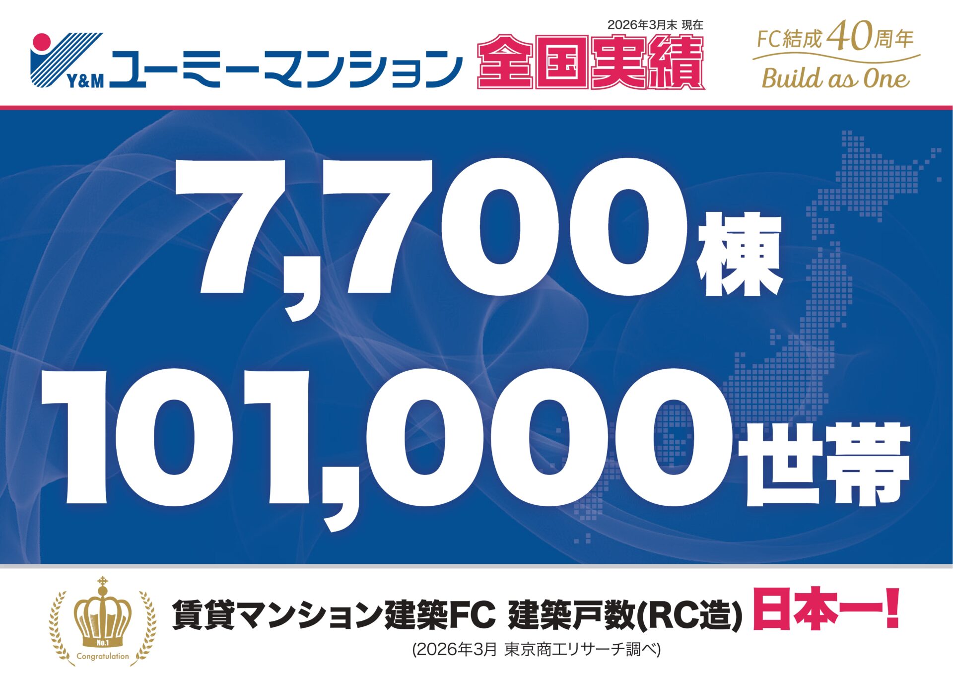 おかげさまで、ユーミーマンションは全国累計7,700棟・101,000世帯を突破いたしました。 私たち宮崎建設株式会社は、この大きなネットワークと40年の歴史に裏打ちされた実績と信頼をもとに、これからも地域の皆様の快適な暮らしを支え続けてまいります。